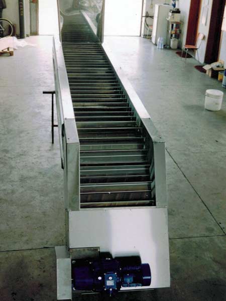 A catena: ideali per la movimentazione dei cereali, semi oleaginosi e legumi, attraverso percorsi orizzontali o leggermente inclinati, i trasportatori a catena sono progettati per garantire il migliore rendimento anche nelle condizioni di lavoro più difficili. Essi rappresentano la migliore scelta per quelle applicazioni a passi che richiedono un’elevata precisione di posizionamento del nastro. Le sagome delle palette possono variare a seconda del particolare da alimentare. I trasportatori a catena molto silenziosi e caratterizzati da una robustezza elevata.